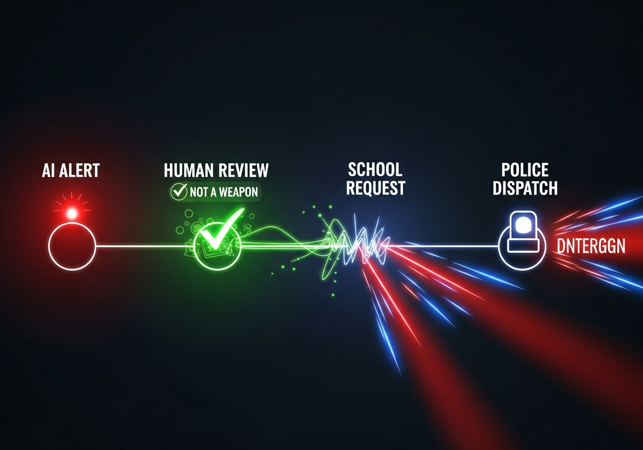 이번 상황은 학교가 도입한 AI 기반 총기 감지 시스템에서 시작됐다. 이 시스템은 교내·교외 감시카메라 화면에서 ‘무기처럼 보이는 물체’를 탐지하면 곧바로 경보를 전송하는 방식이다. 학교 측에 따르면 경보가 발생한 직후, 외부 기술업체와 교육구 안전팀의 인적 검토에서 “실제 총기가 아니다”라는 판단이 내려졌다고 한다. 그러나 이 결론이 현장에 즉시 반영되지 못한 채 학교가 학교자원경찰(SRO)과 지역 경찰서에 추가 지원을 요청했고, 결국 무장 대응으로 이어졌다는 것이다.