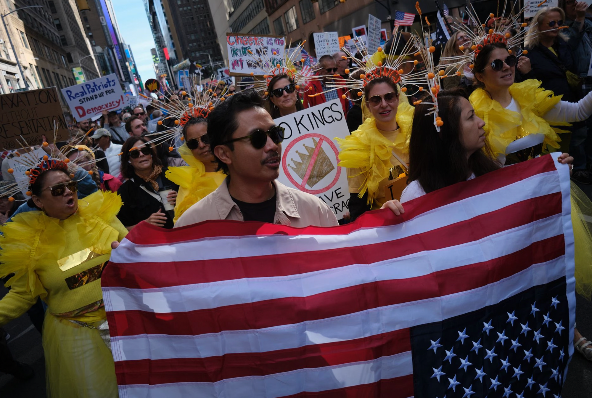 ‘노 킹스(No Kings)’ 시위는 19일 미국 50개 주에서 동시다발적으로 진행돼, 수백만 명이 거리로 나왔다. 참가자들은 “1776년 이후로 왕은 없다(No Kings Since 1776)” “이건 내 생애 첫 독재라 미안하다” 등의 문구가 적힌 피켓을 들고 트럼프 행정부에 항의했다.